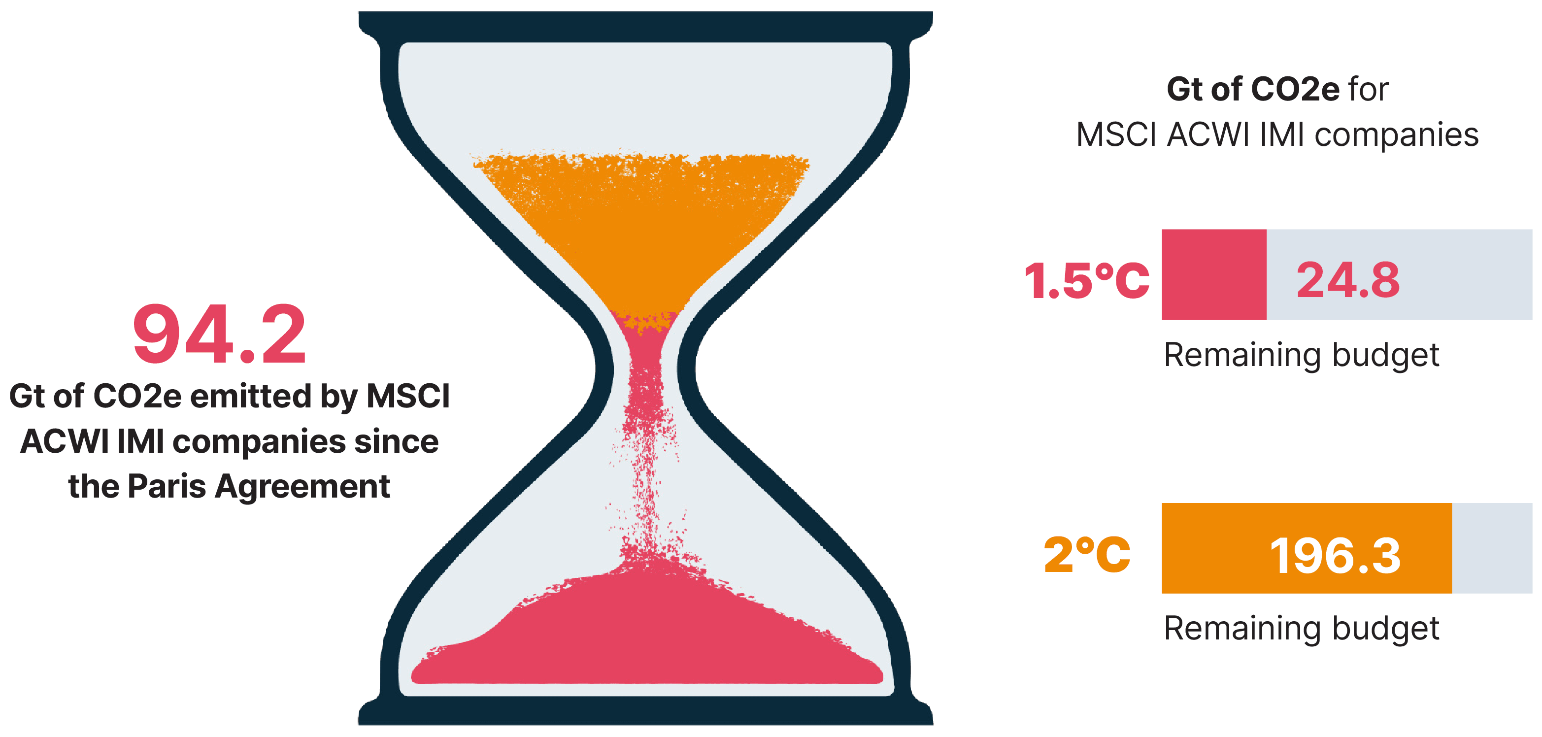 Source: MSCI ESG Research, data as of Aug 31, 2024. The hourglass and countdown clock show annual total Scope 1 emissions of MSCI ACWI IMI constituents (not index-weighted) based on listed companies' reported emissions data and MSCI estimates as of Aug 31, 2024. Emissions for 2023 that companies haven't yet reported are based solely on MSCI estimates, given a lag in company reporting. The remaining future emissions budget to achieve a 1.5 degrees C and 2 degrees C warming scenario are calculated based on bottom-up estimates (sum of remaining emissions budget of all MSCI ACWI IMI constituents) as of Aug. 31, 2024.