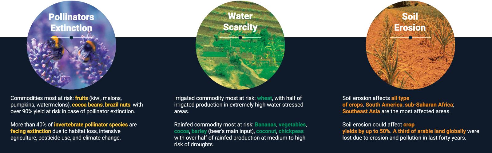 Source: Pollinator extinction; Ritchie, Hannah. "How much of the world's food production is dependent on pollinators?" Our World in Data, Aug. 2, 2021; "The global assessment report on Biodiversity and Ecosystem Services." IPBES, 2016. Water Scarcity: World Resources Institute Aqueduct Food tool, wri.org. Soil Erosion: "Let's #StopSoilErosion to ensure a food secure future." Food and Agriculture Organization of the United Nations, May 15, 2019; Cat, Linh Anh, "Soil Erosion Washes Away $8 Billion Annually." Forbes.com, May 21, 2019.