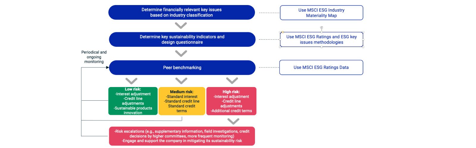 This chart demonstrates examples of sustainability integration in the lending process and does not constitute advice on business operations or lending decisions. Source: MSCI ESG Research