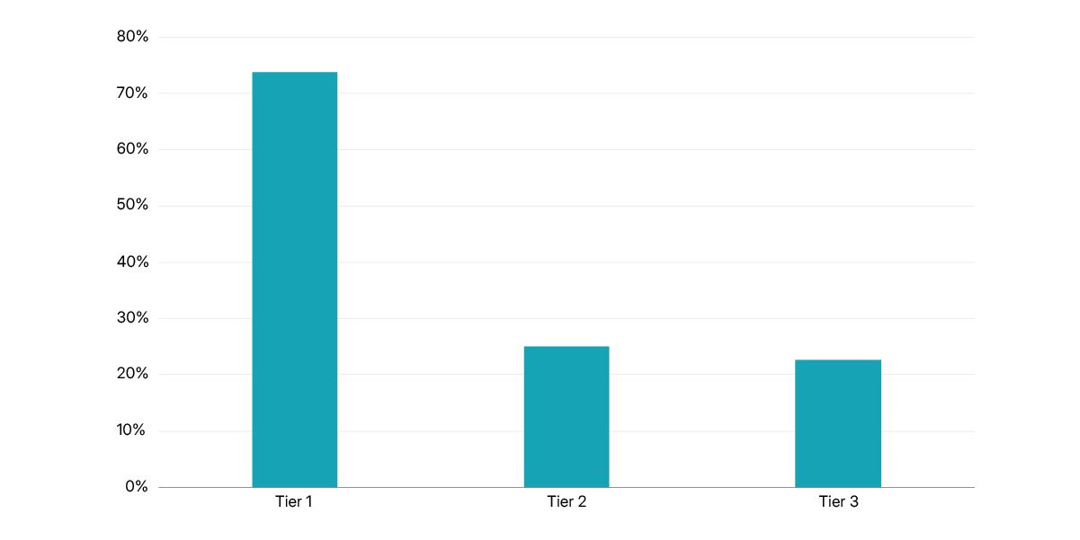 Data as of April 24, 2025. The chart shows the percentage of disclosure for A&D on supplier certifications. Tier 1 is a company’s direct suppliers, Tier 2 is its subtier suppliers and Tier 3 is its raw-material suppliers. Source: MSCI ESG Research