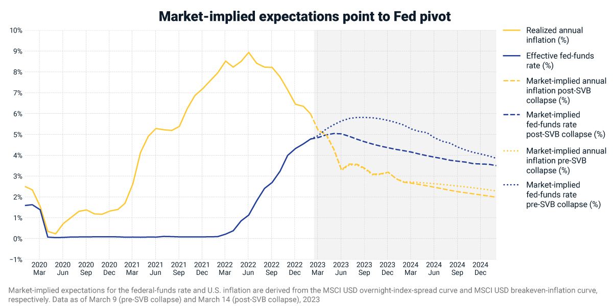 Market-implied expectations for the federal-funds rate and U.S. inflation are derived from the MSCI USD overnight-index-spread curve and MSCI USD breakeven-inflation curve, respectively. Data as of March 9 (pre-SVB collapse) and March 14 (post-SVB collapse).