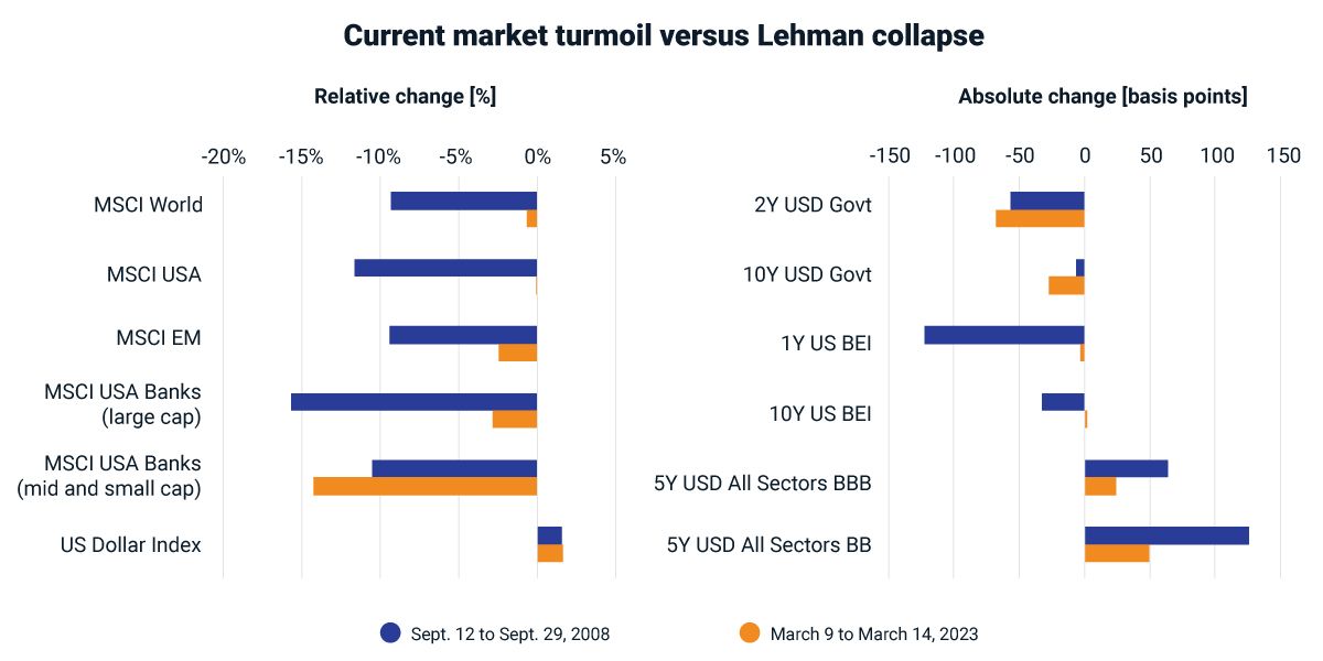 Returning to our earlier scenarios for 2023, some could argue that a "hard landing" has now become more likely. While those scenarios focused on market performance over the full year, investors may also want to consider drawdown risks.2 The recent market turmoil showed similar — though generally less severe — risk-off dynamics as during the aftermath of Lehman Brothers' collapse, with stocks and corporate bonds selling off, Treasurys rallying and the U.S. dollar strengthening. There are important differences, however: The effects on the broad equity and corporate-bond markets have been less strong; U.S. mid- and small-cap bank stocks experienced a steeper sell-off than in 2008; and breakeven-inflation rates dropped significantly less.