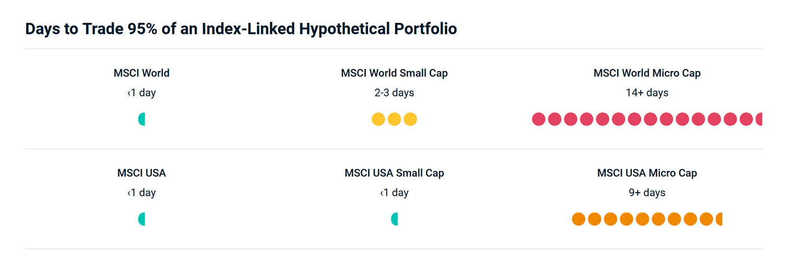 Investability and tradability, are two vital touchstones of our Global Investable Market Indexes (GIMI) construction methodology. The number of days it would have taken to replicate indexes that consist of large- and mid-cap stocks (e.g., the MSCI World and MSCI USA Indexes) and indexes that consist of small caps (e.g., the MSCI World Small Cap and MSCI USA Small Cap Indexes) has been very low (no more than three days in the case of global small-cap stocks). Assuming a maximum daily trading limit of 20%, hypothetical portfolios aiming to replicate the small-cap indexes would have taken longer to trade than those seeking to replicate the large- and mid-cap indexes, but only by a matter of a few days. Actually, in the case of the MSCI USA Indexes, it would have taken less than a day to complete 95% of a USD 1 billion index-tracking portfolio for both indexes, regardless of market cap.