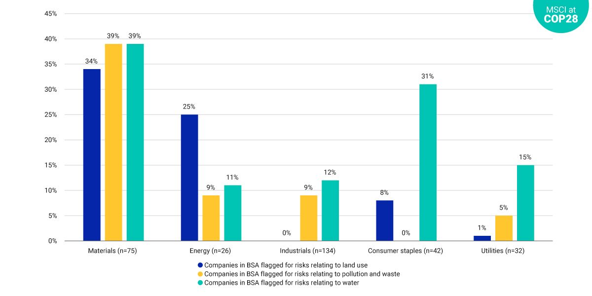 The constituents (n=4,307) of the MSCI AC Asia Pacific IMI flagged for assets in BSA (n=309) were assessed on their exposure to the above risks using data from the following key issues in the MSCI ESG Ratings model: biodiversity and land use, toxic emissions and waste, and water stress. Data as of Nov. 24, 2023. Source: MSCI ESG Research
