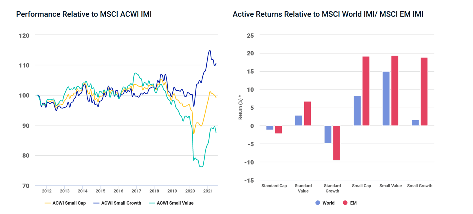 Many market participants recognize that small caps and value companies have often played a strong part during economic recoveries, and this recovery has been no exception. The economic indicators and reopening of the global economy, following the roll-out of COVID-19 vaccines in November 2020, have marked a strong comeback in the performance of small-sized companies — which outperformed large- and mid-cap stocks across developed and emerging markets — and in the resurgence of value companies over their growth counterparts.