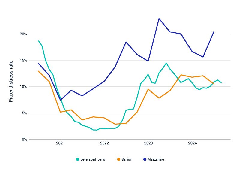 Proxy distress rates for Markit iBoxx USD Leveraged Loan Index and senior and mezzanine private-credit loans. We treat private-credit loans marked at least 20% below cost and leveraged loans trading at least 20% below par as distressed. Leveraged-loan data through August 2024; private-credit loan data through June 2024. Source: MSCI, S&P Dow Jones