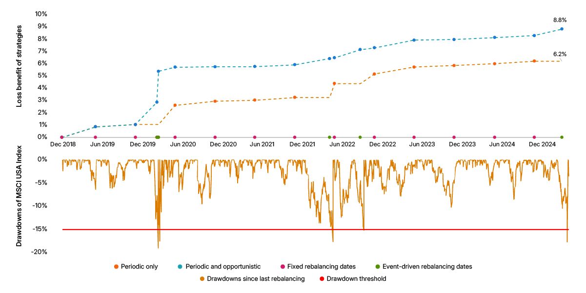 - Periodic and opportunistic — semiannual rebalances, as in the periodic-only strategy, and rebalances following drawdowns of 15% or more in the MSCI USA Index that occurred after the previous rebalancing date.