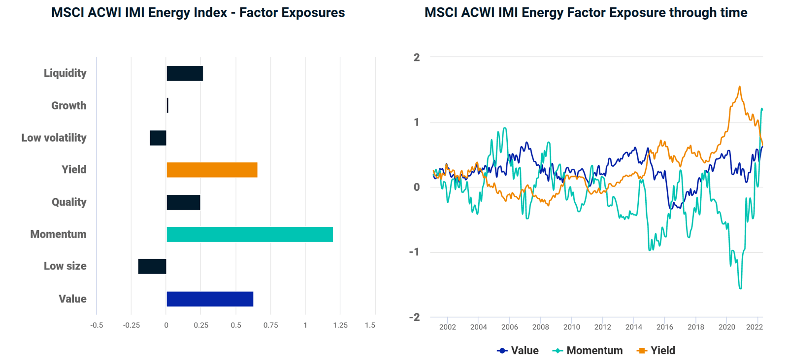 Energy, as represented by the MSCI ACWI IMI Energy Index, has been the best-performing sector in the year to date (+21.2% vs. the MSCI ACWI IMI Index's -12.9%).1 The most recent FaCS snapshot of the index shows strong exposure to the momentum, yield and value factors. Although the war in Ukraine had a significant impact on the supply and price of oil, the energy sector had started to recover from the impact of 2020's COVID-19-related lockdowns by early 2021, as illustrated by the upward trend for momentum exposure shown in the second chart below.