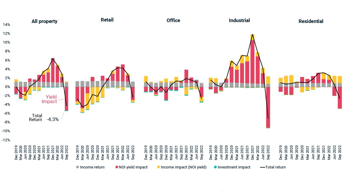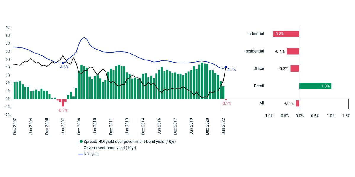 Following its recent sharp increase, the 10-year U.K. government bond-yield has risen above the net-operating-income (NOI) yield of U.K. real estate for the first time since 2007. The evaporation of property's yield premium — amid the recent deteriorating macroeconomic outlook and rising inflation and interest rates — weighed on performance to the extent that the MSCI UK Quarterly Property Index in the third quarter recorded its worst return since the second quarter of 2009.