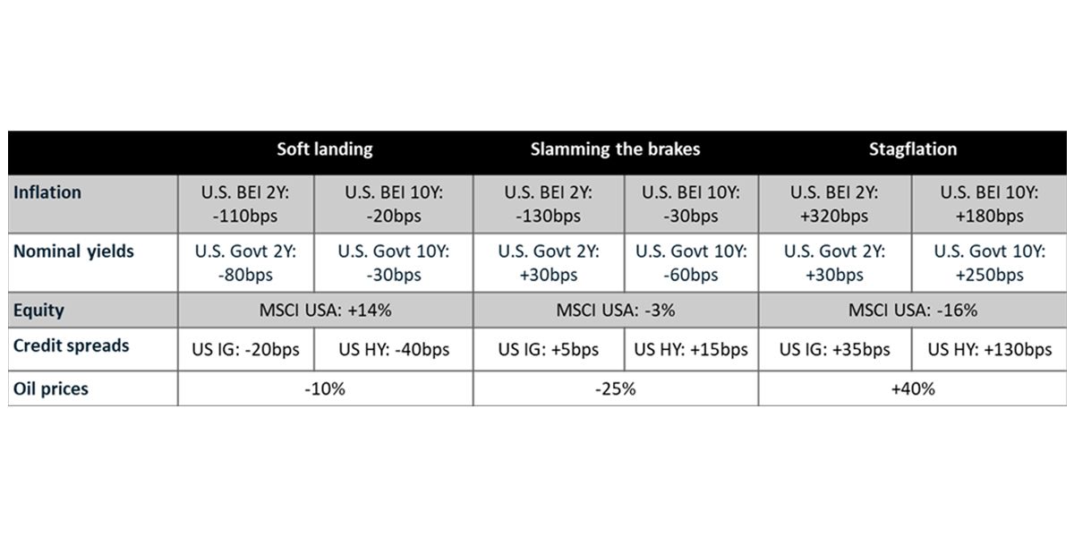 In April, we published three scenarios for U.S. inflation and Fed policy based on assumptions for macroeconomic shocks and central-bank-policy strength and credibility with the public. The exhibit below shows the market shocks under three different scenarios. While markets can gyrate sharply in times of uncertainty, these scenarios focus more on the macroeconomic fundamentals and may take longer to play out.