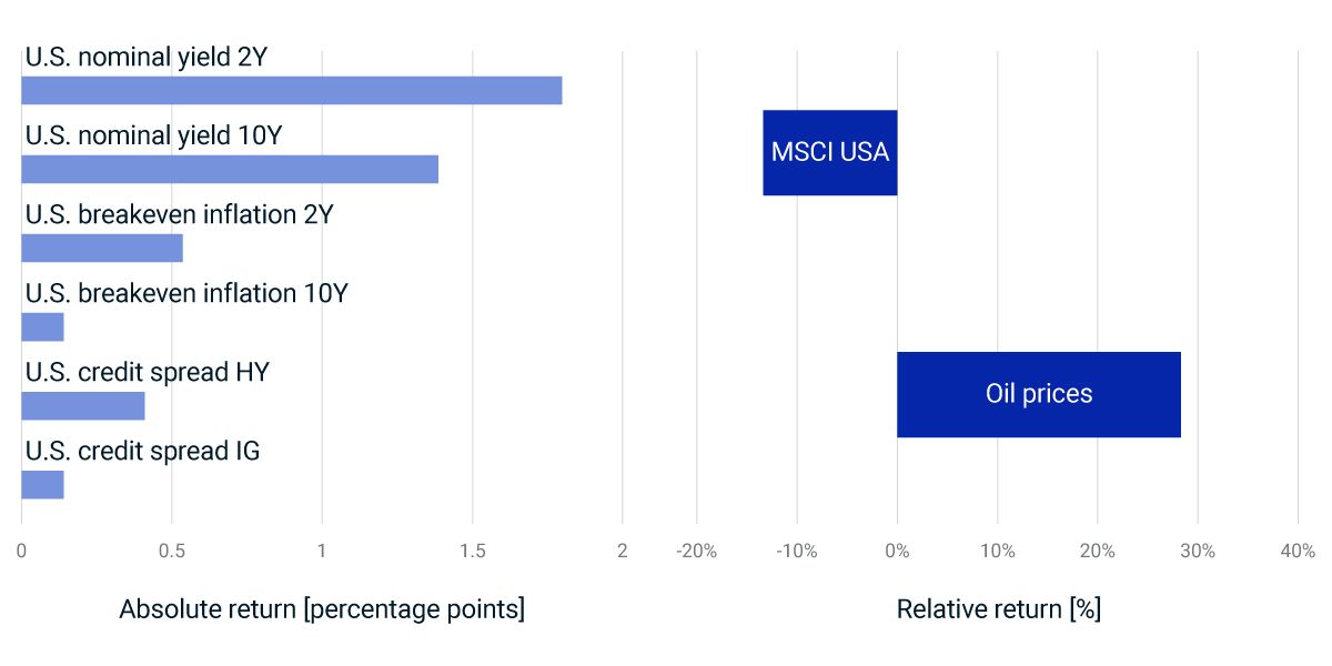 Since the Russia-Ukraine war started, nominal and short-term breakeven-inflation yields increased significantly, the equity and credit markets sold off and oil prices went up. Although the shock magnitudes may differ, these market moves match best with our stagflation scenario, characterized by sustained high inflation and a longer-term economic slowdown. The question for investors is whether the Fed's "Slamming the brakes" and hiking more aggressively could bring inflation down — but potentially at the cost of creating headwinds against short-term growth. Alternatively, we may head further toward the grim "Stagflation" scenario, where inflation remains high despite growth concerns. According to our recent stress test, for a diversified portfolio with global equities and U.S. bonds and real estate, the "Slamming the brakes" scenario could result in a nearly flat medium-horizon return, which would be far better than the 13% loss under the stagflation outcome.