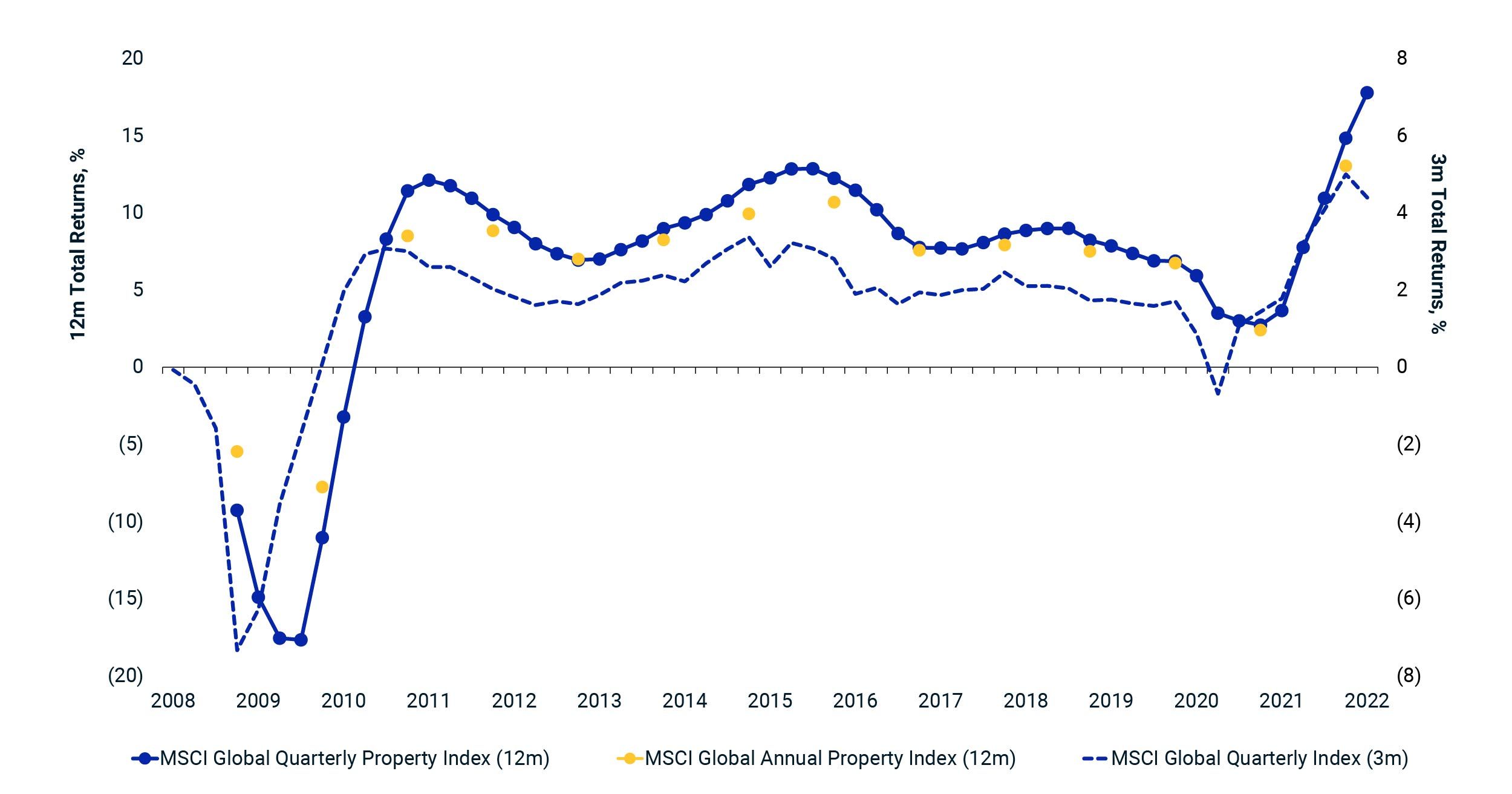 1 The MSCI Global Quarterly Property Index, which starts 2007, provides a more-frequent indicator of global and national property performance by tracking only properties that are valued on a quarterly basis, but with a reduced sample of eligible properties versus the MSCI Global Annual Property Index.