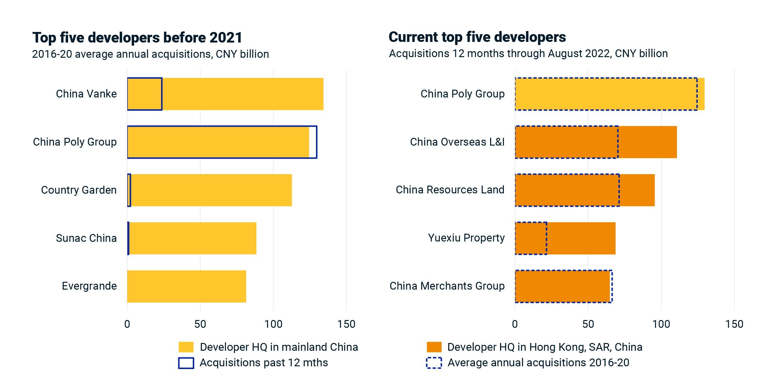The slowdown in China's property market took its toll on the domestic appetite for development land this year, with mainland Chinese developers scaling back acquisitions. Many of the major players have withdrawn from the market almost entirely, as residential sales plummeted and refinancing difficulties persisted. At the same time, this decline has provided an opportunity for others — notably developers from Hong Kong — to strengthen their foothold.