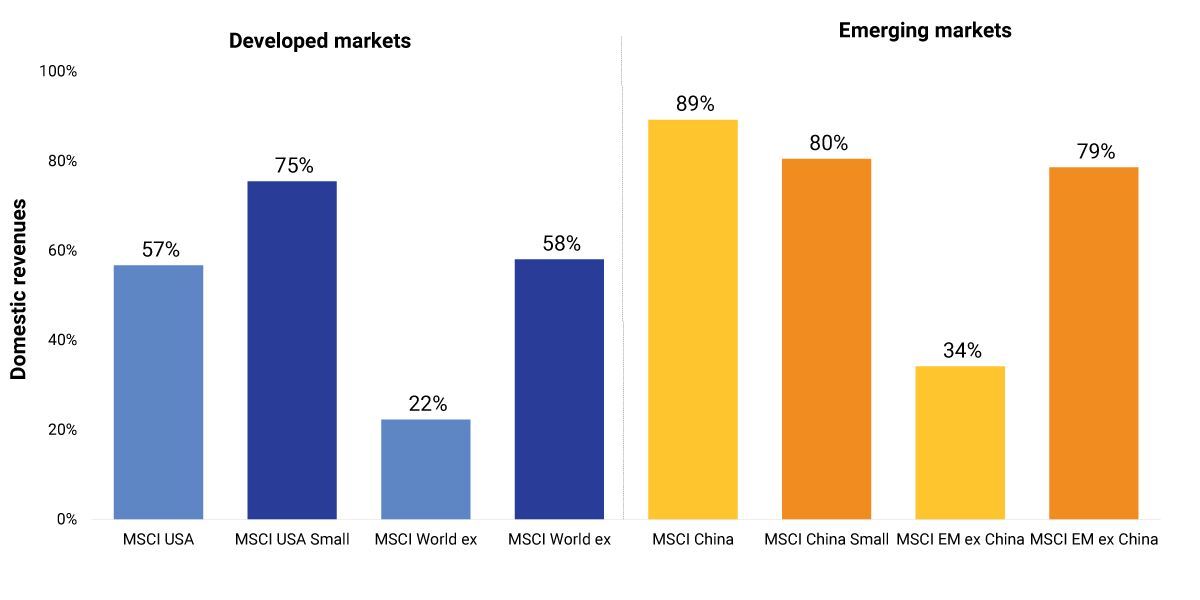 We found that small caps in China, proxied by the MSCI China Small Cap Index, had slightly higher international revenues than large caps in the MSCI China Index. A likely explanation is that Chinese firms have established themselves as major suppliers to the developed world.