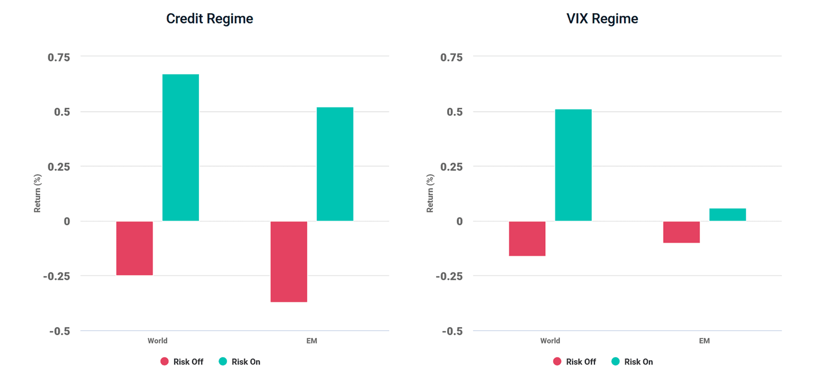 Data from Dec. 31, 1998, to June 30, 2021. A risk-on VIX regime is a period when the VIX term structure denoted by VIX (1-month) / VIX (3-month) is below 0.975. A risk-off VIX regime is a period when the term structure is above 1.025. A risk-on credit regime is a period when the OAS of the BAML US Corporate BBB Index is at least 0.25 below its 12-month average. A risk-off credit regime is a period when OAS is at least 0.25 above its 12-month average."