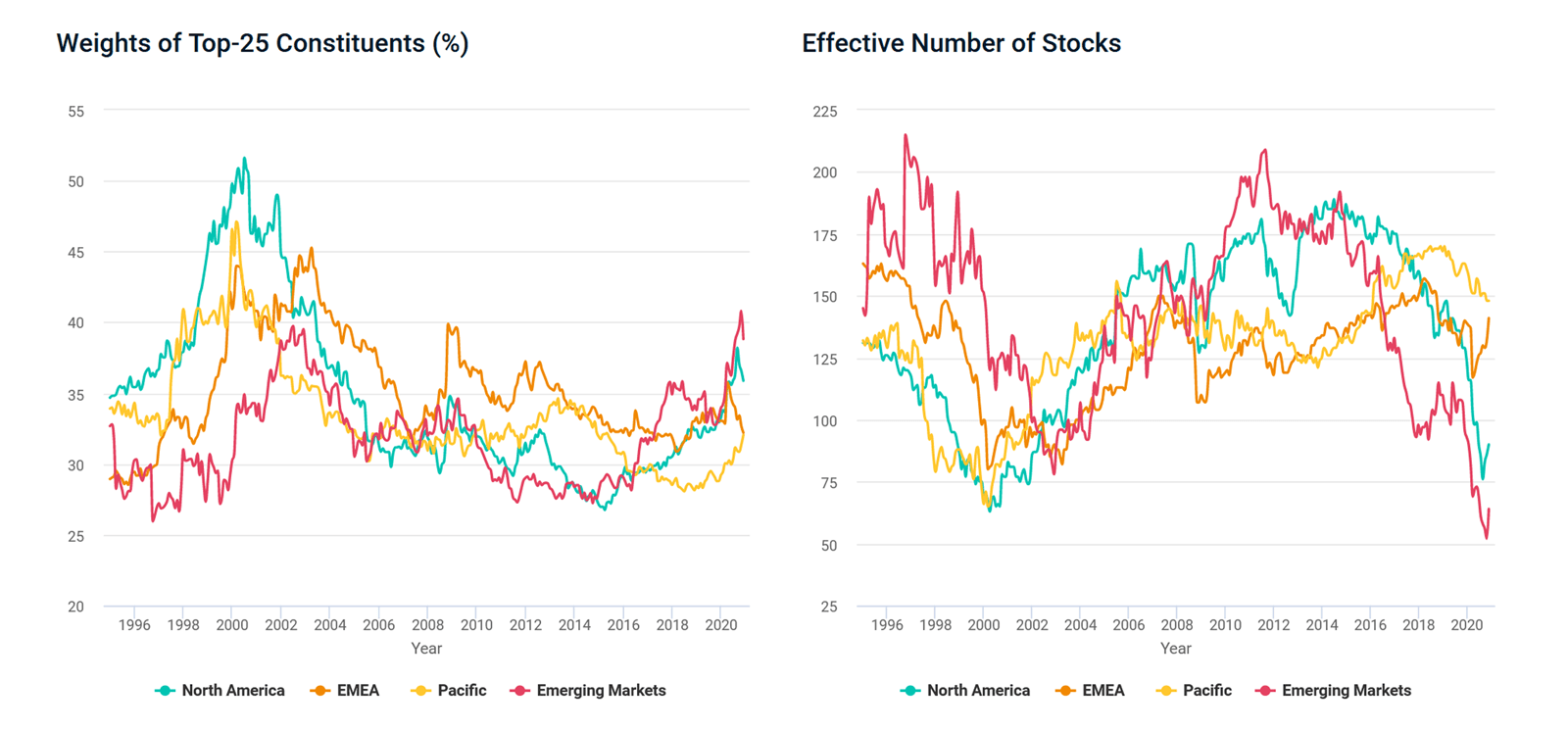 For example, based on the weights of the top-25 constituents in the MSCI North America Index, concentration as of Nov. 30, 2020, was lower than it was in the late '90s. The effective number of stocks, however, shows great similarity, with higher concentration levels over both periods. As the effective number of stocks has fallen and the proportion of the top 25 has gone up in recent years, investors focused on individual regions or countries may find they are less diversified than they thought.
