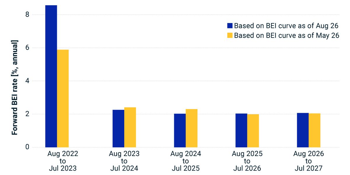 Inflation expectations based on swap-market data indicate 8.5% inflation for the year to come, which is 2.5 percentage points higher than the level prior to the ECB's announcement of monetary-policy normalization on June 9 (as shown in the exhibit on the left below). This raises the question of whether investors are concerned that the current pace of tightening is not aggressive enough. In the following year, however, inflation is expected to plunge to levels close to the 2% target.
