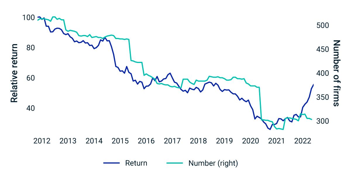Yet the size of the energy sector is a fraction of what it was just a decade ago. Beset by bankruptcies, delistings and firms going private, the number of energy firms has fallen by 60% from its peak in 2012. In line with this trend, only 300 of the more than 9,000 firms in the MSCI ACWI IMI Index are in the energy sector.