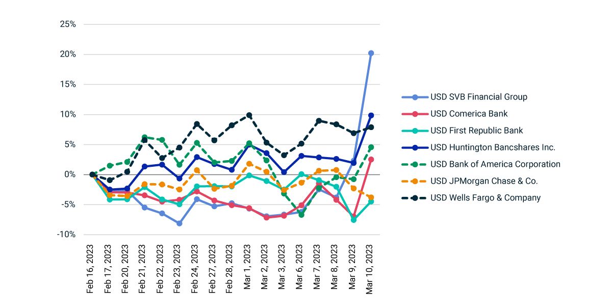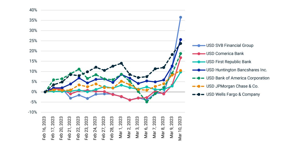 As of market close on March 10, we find that regional banks suffered more, relative to national banks. Looking at the issuer-specific return of a sample of three national and three regional banks' bonds, issuer-specific spread remained flat or tightened for national banks JPMorgan Chase & Co. and Wells Fargo & Company. The exception for national banks was The Bank of America Corporation, whose issuer-specific spread widened on Friday after tightening on Thursday. In contrast, the issuer-specific spread of all three regional banks in the sample (Comerica Bank, First Republic Bank and Huntington Bancshares Incorporated) widened significantly.