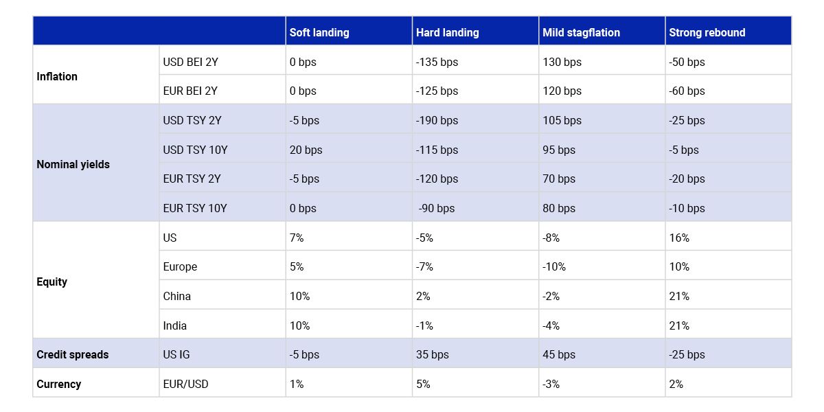 Scenario assumptions are informed by the MSCI Macro-Finance Model, analysis of historical data and judgment. Breakeven inflation (BEI) is measured in basis points (bps). These are not forecasts, but hypothetical narratives of how the macroeconomic scenarios could affect multi-asset-class portfolios.