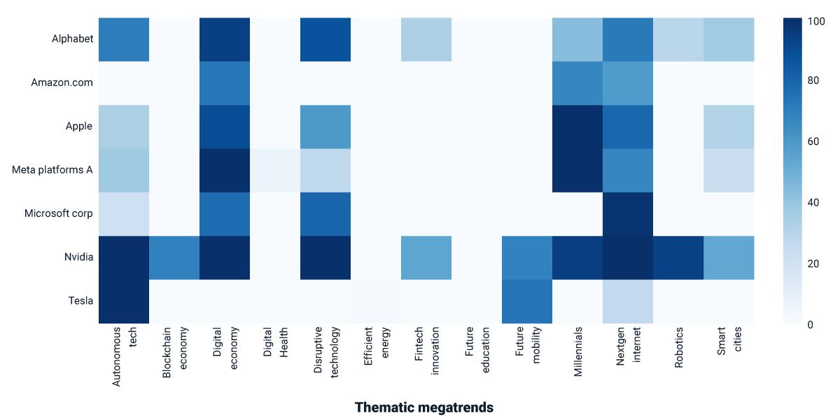 Part of the reasoning for this equity-market rally may be investors' expectations of the future earnings potential of these seven stocks due to their exposure to structural megatrends. To test this theory, we looked at these stocks through the lens of MSCI thematic exposures divided into megatrend categories. All seven — including AI-driven NVIDIA Corp., which returned 156% through May 31 — had high relevance scores or economic association to most of the relevant megatrends.