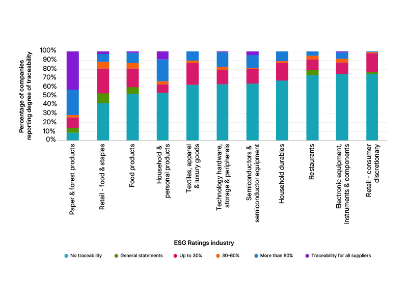 Our analysis reveals that many industries depend on complex, multi-tiered supply chains, yet levels of raw-materials traceability vary significantly. Notably, retail — consumer discretionary, electronic equipment, instruments and components and restaurants — reported the lowest levels of traceability.1 This presents a risk for retailers, especially within consumer discretionary, who source a wide range of products — from apparel and accessories to books and electronics — across numerous global supply chains.
