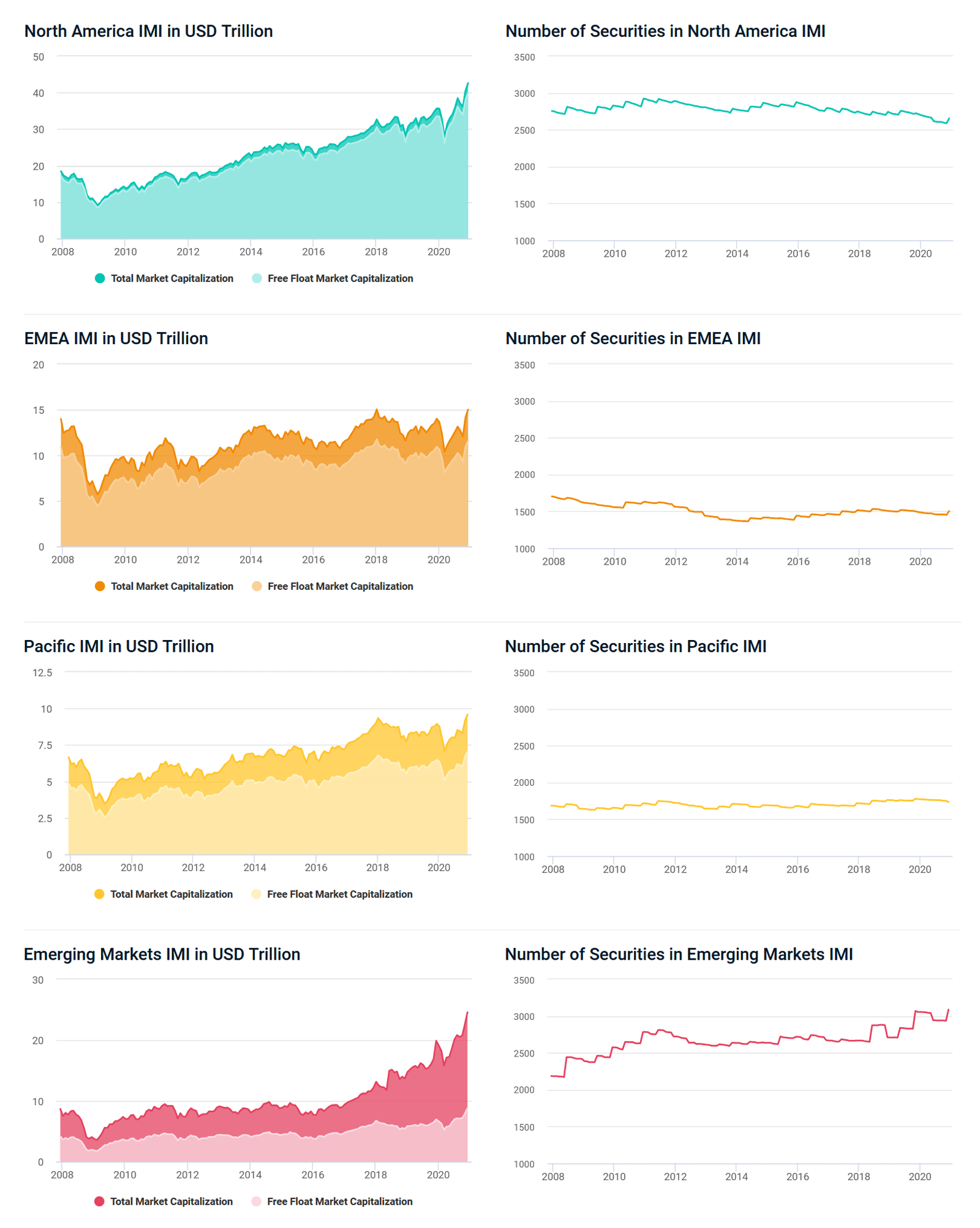 Looking at the MSCI North America Investable Market Index (IMI), for example, we see the difference between total market capitalization and free-float market capitalization was relatively stable throughout the period shown, as it was for the MSCI EMEA and MSCI Pacific IMI, though differences in these regions were larger. The number of securities in all three markets fell slightly between 2010 to 2012, with MSCI EMEA IMI showing the largest and most persistent decline.