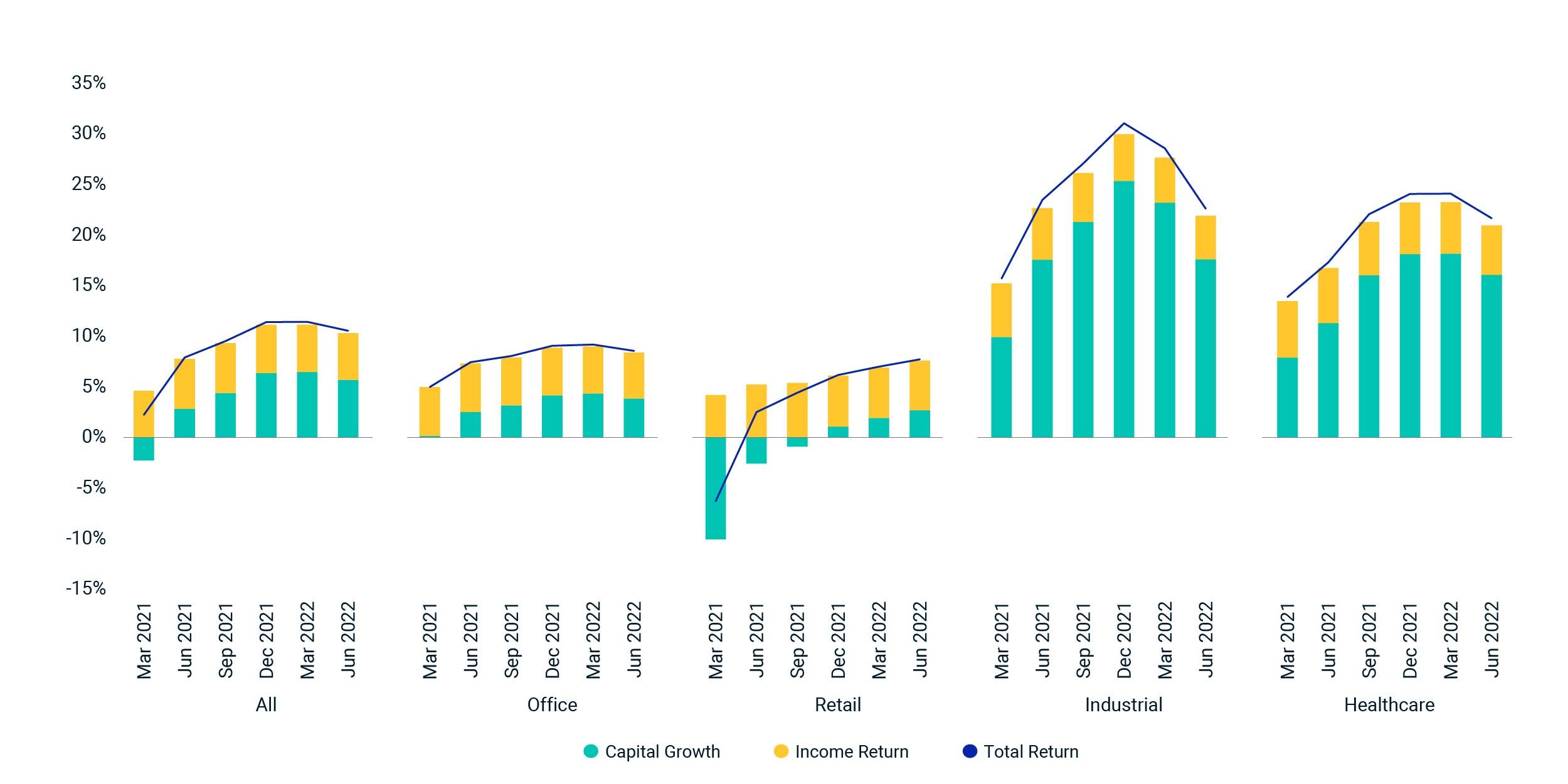 Global real estate returns accelerated to 17.8% on a 12-month rolling basis in the first quarter of 2022 despite the growing headwinds of geopolitical tensions and associated rising inflation and interest rates.
