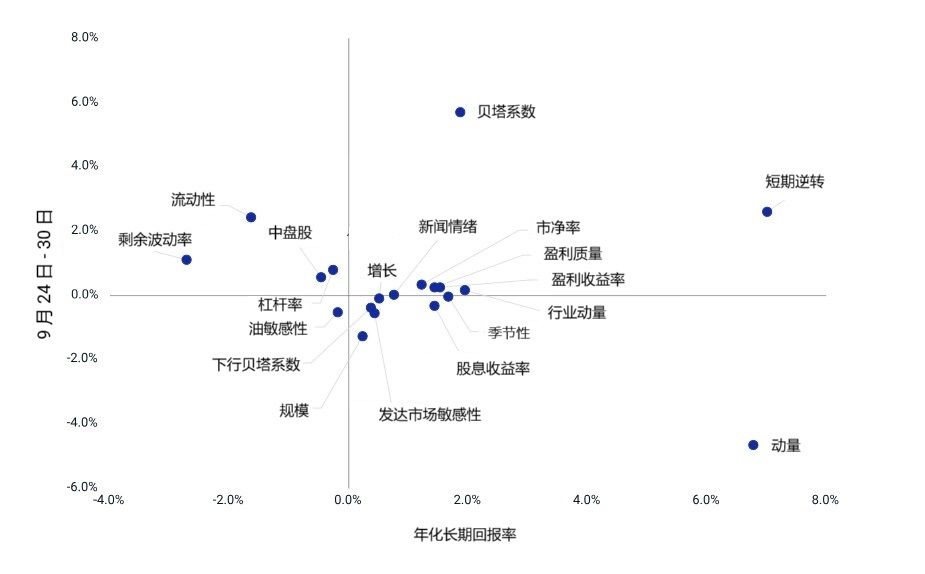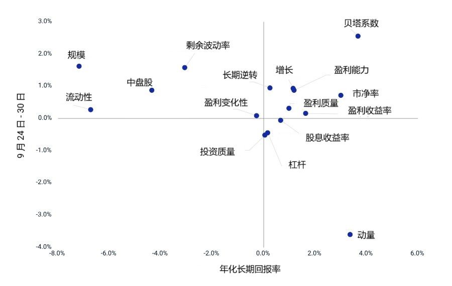 为了帮助投资人了解市场反应背后的机制,我们对照风格因子的长期趋势,比较了其在截至 9 月 30 日的五个交易日中的表现。在某种程度上,这些因子的表现与行业组的表现相呼应。