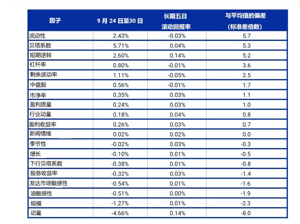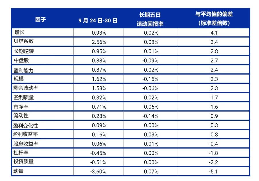 - 中国于 9 月 24 日宣布的经济和市场刺激措施触发了市场大幅反弹,其中受政策扶持的行业、波动率及流动性因子,因流动性的迅速涌入和市场情绪的大幅提振而获益最多。