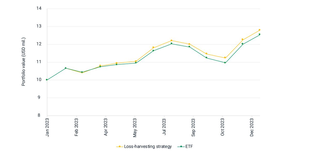 To illustrate the potential benefits and related trade-offs of this strategy, we compared the after-tax returns a hypothetical U.S.-domiciled investor could have obtained from an ETF tracking the MSCI USA Index and from a simulated loss-harvesting strategy for a portfolio of individual stocks with similar market exposure.2 We assumed a cash-funded portfolio of USD 10 million at the end of 2022. All realized losses incurred would thus be short term. For simplicity, we assumed no other constraints.3