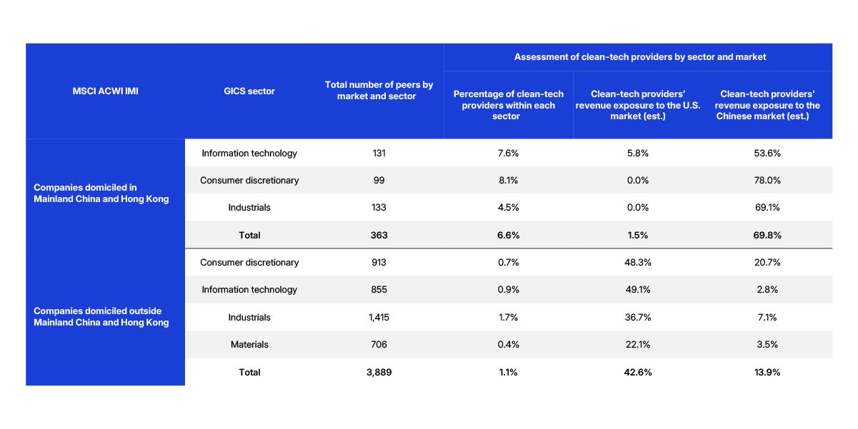 Data as of April 14, 2025. Sectors refer to the Global Industry Classification Standard (GICS®) sectors. GICS is the global industry-classification standard jointly developed by MSCI and S&P Dow Jones Indices. Using MSCI Sustainable Impact Metrics, this research defined constituents of the MSCI ACWI IMI that generated over 50% of their revenues from clean-energy technologies as clean-tech providers. In this research, clean-energy technologies reliant on critical minerals included renewable-energy equipment, electric vehicles, energy-storage systems and LEDs. Clean-tech providers’ revenue exposure to the markets was calculated by aggregating their estimated sales generated within those markets. Source: MSCI ESG Research