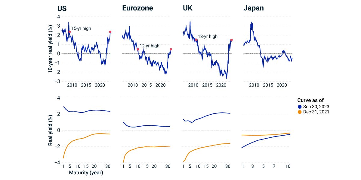 Shorter-maturity real yields increased the most. Between Dec. 31, 2021, and Sept. 30, 2023, one-year real yields in the U.S., U.K. and eurozone surged by more than 500 basis points (bps), while the 10-year real yields rose by more than 250 bps.