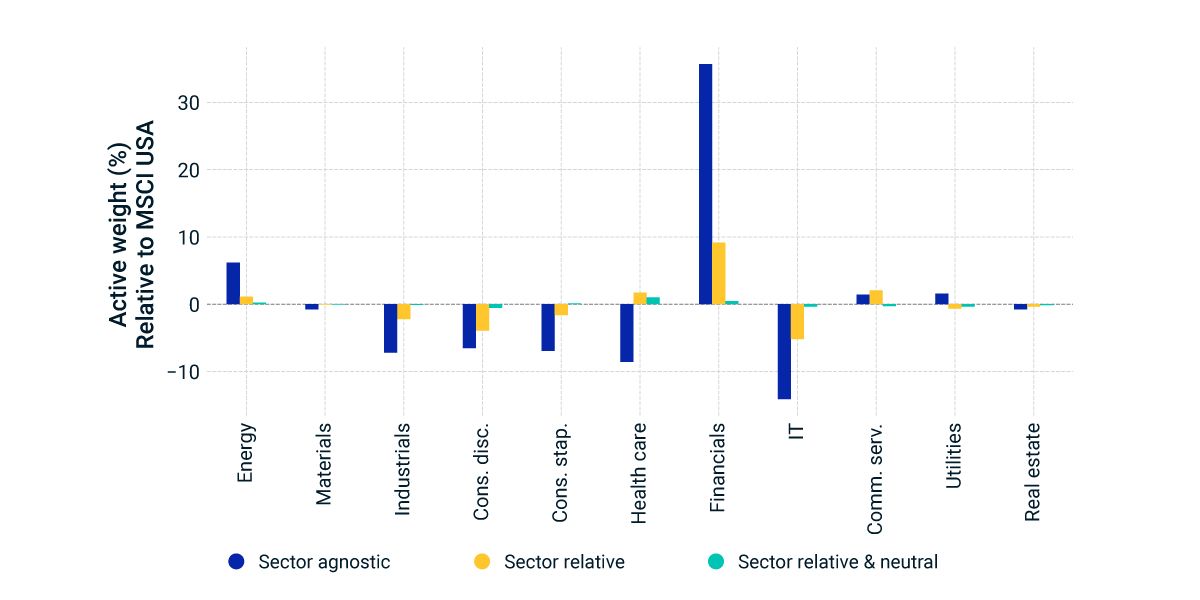1 Selecting companies based on their sector-relative value scores can lead to active weights in sectors. The sector-neutral approach implements an additional layer of equating sector weights of the strategy to that of the parent.