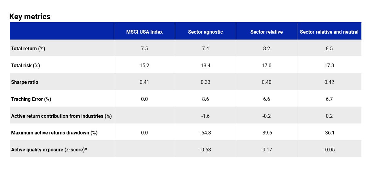 The sector-relative approach mitigated many of these effects, but still resulted in sizable sector tilts. In contrast, we found that applying sector neutrality and relativity (as was done in the sector-relative and -neutral approach), derived the value premium without taking on the outsized risks present in the other approaches.