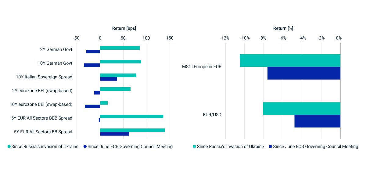 Since the Russia-Ukraine war started in late February, we have seen market moves which are directionally aligned with our "Stagflation" scenario: nominal and breakeven inflation (BEI) rates and credit spreads increased while European equities and the EUR/USD exchange rate dropped. Since the ECB's June policy meeting, market-implied inflation expectations and nominal rates have decreased, but equities and the euro continued to slide, and Italy's sovereign spread widened further — events more aligned with the "Slowing growth" scenario.