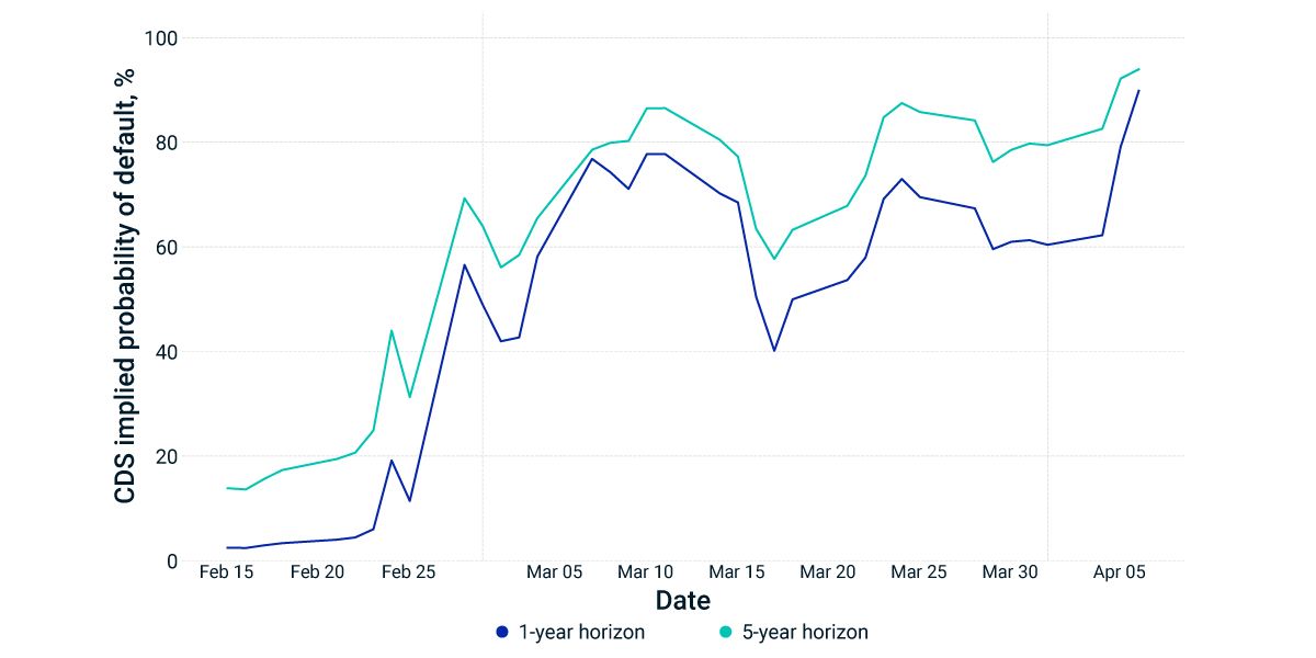 Probabilities of Russian default implied by credit-default swaps , which we've been tracking closely, are at their highest levels since the invasion. The default probability is 90% over a one-year horizon and 94% over a five-year horizon. Russia has now entered a 30-day grace period in which it might be able to avoid default if it finds another source of funds for the payments. Barring this, Russia will be heading toward its first default on hard-currency debt since the one triggered by the 1917 Bolshevik Revolution.