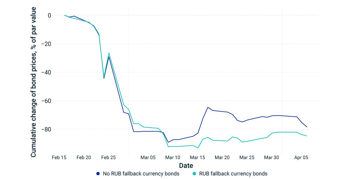 Since the invasion, the newer bonds have generally experienced larger losses, suggesting investors have so far placed greater value on the older bonds. This may be a result of many bondholders having preferred to be paid back in dollars and euros, rather than in hard-to-use rubles. This week's missed payments on the older bonds may cast doubt on the benefit of the no-fallback clause.