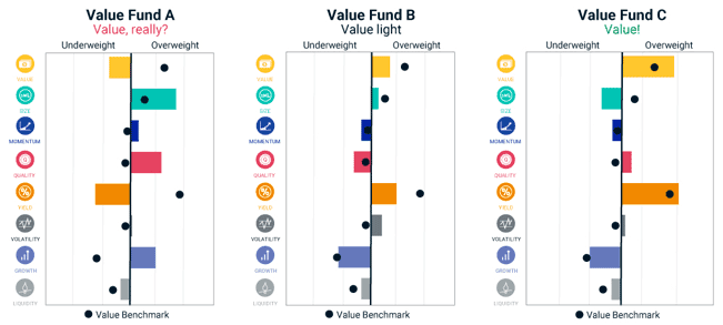 - Value Fund C has higher exposure to value than both previous funds and an overweight to value relative to the benchmark.