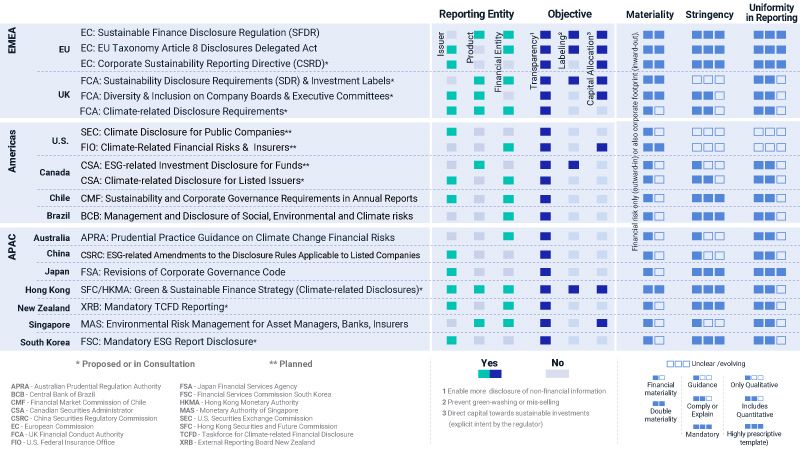 With at least 34 regulatory bodies and standard setters in 12 markets undertaking official consultations on ESG in 2021 alone, it's no wonder that companies' and investors' heads are spinning. We see convergence in some core areas, yet there are signs of further fragmentation, driven by differing regional priorities. Just take a look at our preliminary analysis below that compared the current pipeline of rules and proposals from select agencies in key jurisdictions along five dimensions: reporting target; objectives; materiality; stringency and uniformity of reporting. All of these proposals tackle the issue of transparency in ESG investment standards, yet there is a lack of uniformity in the other initiatives of the regulations. Such differences could prove a persistent obstacle to global convergence on ESG-related regulations.
