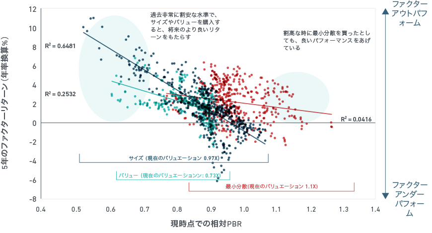 市場対比のバリュエーションと将来のリターンの相関 (サイズ, バリュー、低ボラティリティ)