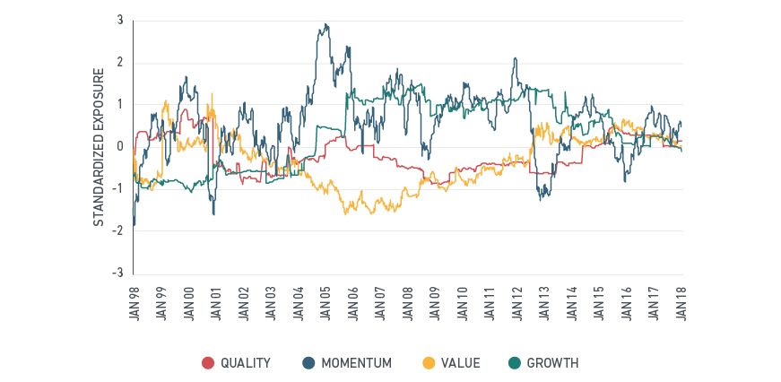 Also important to note is that factor exposures have varied not only across seemingly similar stocks, but have also been quite dynamic and changed over time for individual companies. In the exhibit below we take Apple – which saw its stock price rise on strong second-quarter earnings even as other FAANGs, such as Facebook, fell – as an example. Our analysis shows select MSCI FaCS exposures over time, focusing on the quality, momentum, value and growth factor groups for legibility purposes.