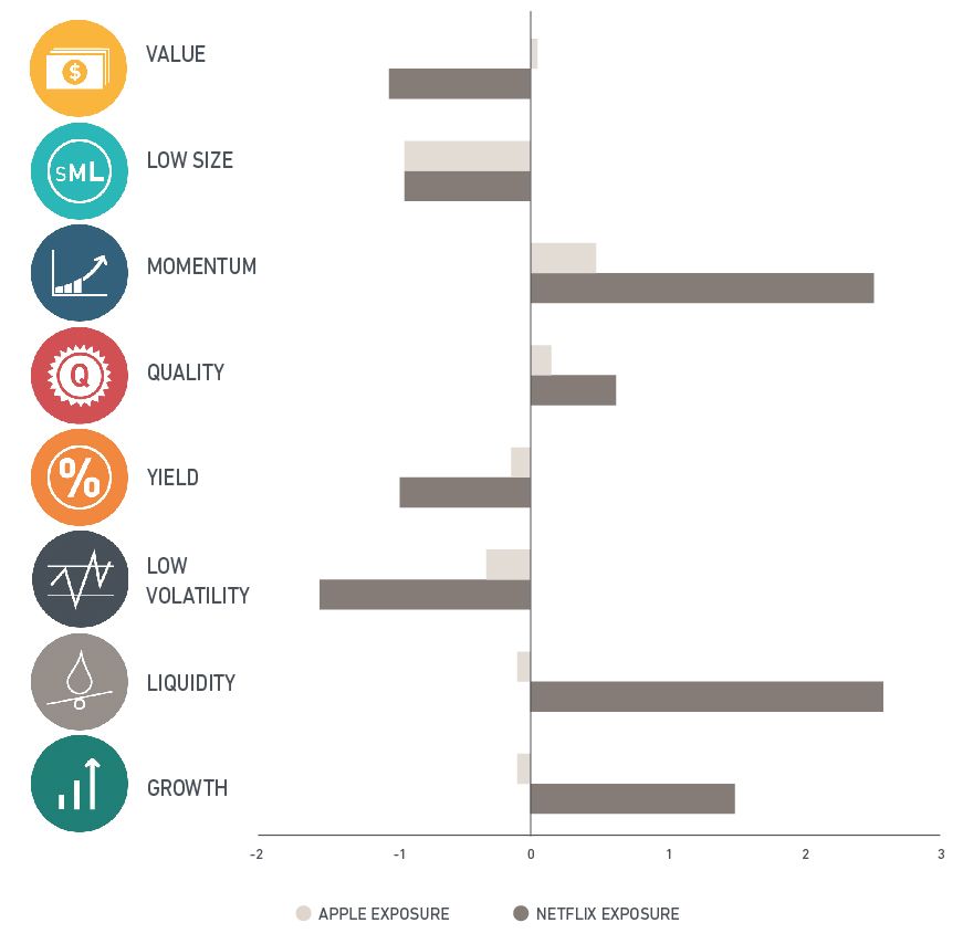 - Growth (historical earnings and revenue growth plus forecast earnings growth): Apple had a slight negative exposure, while Netflix had a very large one.