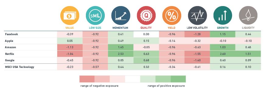 The table below displays the MSCI FaCS characteristics of the FAANG stocks as of July 27, 2018, as well as the exposures of the MSCI USA Technology Index (for reference). FaCS measures the degree to which a company or portfolio tilts, or is "exposed," to factors that have been shown to be important drivers of portfolio risk and return.