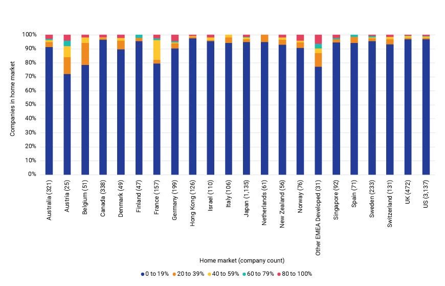 This exhibit displays the proportion of companies, by market, audited by an audit firm relying on a single engagement for 'X'% of their fee base from public-company audits. Data as of Nov. 27, 2023. Source: MSCI ESG Research