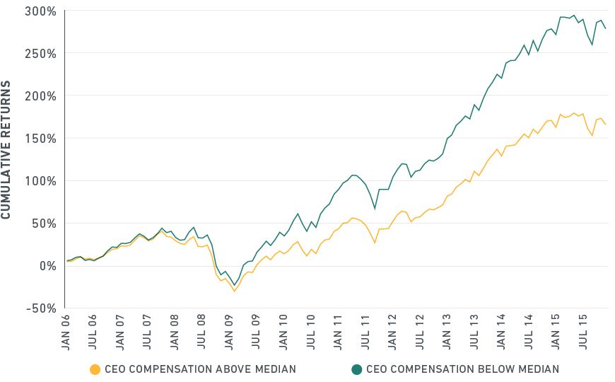 2016 IRRC Institute Investor Research Award Honorable Mention Has CEO pay reflected long-term stock performance? In a word, "no." Companies that awarded their Chief Executive Officer (CEOs) higher equity incentives had below-median returns based on a sample of 429 large-cap U.S. companies from 2005 to 2015. On a 10-year cumulative basis, total shareholder returns of those companies whose total summary pay (the level that must be disclosed in the summary tables of proxy statements) was below their sector median outperformed those companies where pay exceeded the sector median by as much as 39% (see exhibit).1