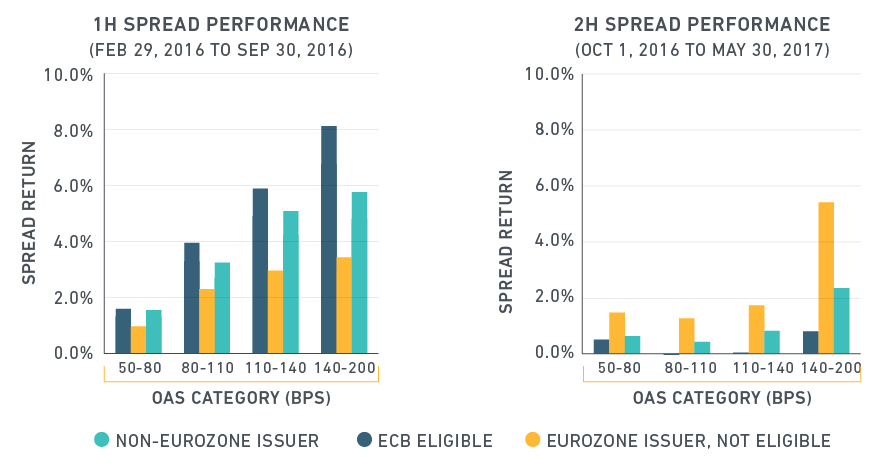 1 We looked at the euro corporate bond market as reflected by the Bank of America Merrill Lynch Euro Corporate Index. To measure spread performance, we apply our performance attribution model based on daily bond-level returns. We split the ECB-ineligible sector into non-eurozone issues and eurozone issues (primarily subordinates and bonds issued by banks). Bonds are also grouped according to their option-adjusted spreads (OAS) to better control for credit risk and liquidity. Note that OAS accounts for the impact of embedded options that are present in many fixed-income securities and is therefore a better measure of value than yield spread.
