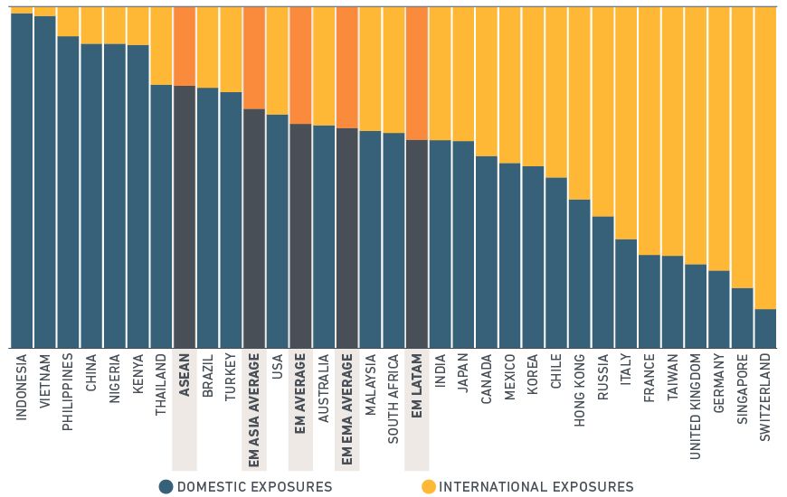 A comparison of the ASEAN Index with broader emerging markets indexes generally highlights the fundamental growth of the former. Dividend yield and dividend growth together accounted for 91% of total returns in ASEAN over the 10-year period ending Dec. 31. In particular, dividend growth for the ASEAN Index exceeded that of the MSCI Emerging Markets Asia Index (which includes China, Taiwan and Korea) as well as the broader MSCI Emerging Markets Index. These growth characteristics reflect ASEAN countries, which together comprise the third-largest population globally. More than half of the population is under 30. Meanwhile, nearly half the population lives in urban areas,1 compared to Japan and the U.S., where 93.5% and 82.4%, respectively, live in urban areas. A lower percentage suggests there is greater potential for growth. With the exception of companies in Singapore, those in ASEAN countries derived more than three-quarters (77%) of their revenues domestically, according to MSCI's economic exposure data. Trade within the bloc accounted for 11% of international economic exposures, as of Oct. 31, 2016. In contrast, companies from more industrialized Asian economies such as Korea and Taiwan derived less than half their revenue domestically. The domestic nature of ASEAN companies' economic exposure may insulate those firms from an increase in protectionist sentiment worldwide.