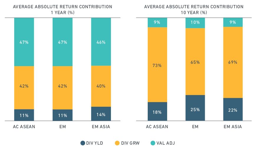 Examining returns by dividend yield, dividend growth (which essentially reflects fundamental growth in cash flows) and changes in valuation illustrates the case. Our research suggests that the first two components historically were the two most important contributors to global equity performance in both emerging and developed markets over the long term (below chart). While valuation changes tended to dominate market performance over the short term, dividend yield and growth in cash flows were critical return drivers over the longer term.