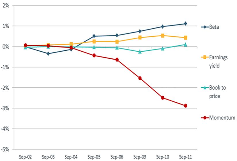 Meanwhile, the performance of other defensive factors, such as size and profitability, was also negative, albeit not to the same extent as momentum. On the other hand, the U.S. earnings yield factor returned 0.5% and had an information ratio of 1.2. Sizable moves among other factors included moves in historical beta, which had strong performance in the U.S. and globally, with IRs of 1.6 and 1.1, respectively; and U.S. value, which was positive, with an IR of 1.3.
